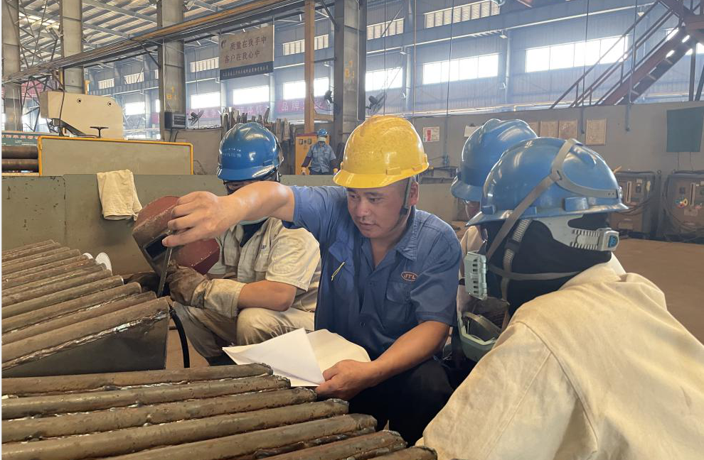 金通靈,一個(gè)有著深厚歷史底蘊(yùn)的企業(yè),是孕育勞模的沃土,多年來,培養(yǎng)出3名省勞動(dòng)模范,6名市勞動(dòng)模范,1名區(qū)勞動(dòng)模范,2018年6月,金通靈成立了勞模集群黨支部,充分發(fā)揮勞模示范效應(yīng),引領(lǐng)產(chǎn)業(yè)工人加入到創(chuàng)新驅(qū)動(dòng)發(fā)展的行列,助力企業(yè)發(fā)展。尹芬興便是勞動(dòng)模范中的代表人物,今年他被評(píng)為“江蘇省勞動(dòng)模范”,年近五十的他已在金通靈走過26年的青春歲月。當(dāng)年尹芬興從安徽老家出來時(shí),他還不到20歲,憑著一腔熱血和對(duì)未來美好的憧憬來到南通工作。他把勞動(dòng)當(dāng)做樂趣,跟同事們交流經(jīng)驗(yàn)、切磋手藝,共同解決工作中遇到的難題是他工作的常態(tài)。26年來,他不斷摸索,不斷學(xué)習(xí),不斷提升,積極發(fā)揮勞模示范帶頭作用,帶領(lǐng)團(tuán)隊(duì)成員積極投身到創(chuàng)新工作中,多年來攻克多個(gè)技術(shù)難題。其中“兩節(jié)身”前盤的成型技術(shù),低溫升蒸汽壓縮機(jī)組合成型免加工藝加強(qiáng)圈技術(shù),干熄焦煤氣風(fēng)機(jī)制作工藝改進(jìn)等創(chuàng)新成果不僅節(jié)約了大量生產(chǎn)成本、縮短生產(chǎn)時(shí)間,更保證了產(chǎn)品質(zhì)量,為公司創(chuàng)造了巨大經(jīng)濟(jì)效益。如今的尹芬興是葉輪成型組一組組長(zhǎng),每日負(fù)責(zé)的事情繁雜,他卻總能一絲不茍地完成,臟活、累活搶著干,白色工作服印著他斑斑勞動(dòng)的印記,也承載了他一路奮斗的榮光。26年來,他始終把“愛一行、干一行、專一行”作為工作的信條,以此激勵(lì)自己在工作崗位上奮發(fā)成才。就是憑著這樣的信念,他在一線崗位上堅(jiān)守了二十余年,用堅(jiān)持堅(jiān)毅的姿態(tài)詮釋著勞模精神,讓勞模精神發(fā)光發(fā)熱。今年,尹芬興光榮地加入中國(guó)共產(chǎn)黨,高舉右拳,在黨旗下莊嚴(yán)宣誓,他黝黑發(fā)亮的面龐上印刻著堅(jiān)定的信仰,從此,懷揣著共產(chǎn)黨人的初心使命,他又踏上了新的征途。